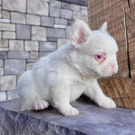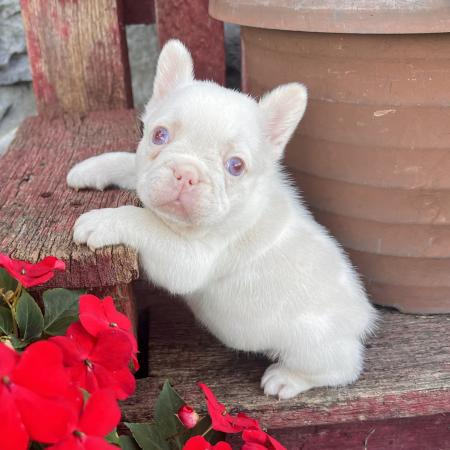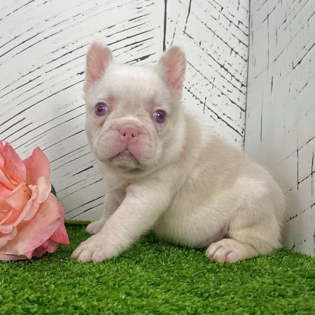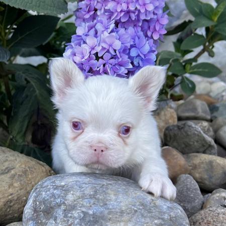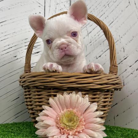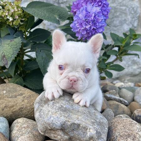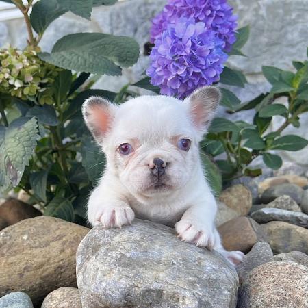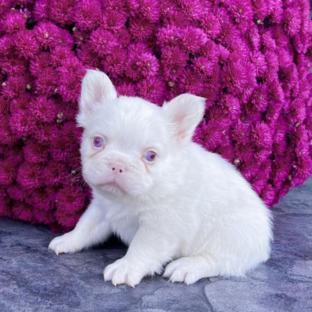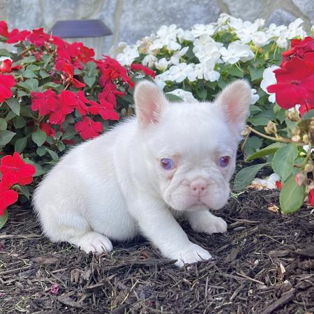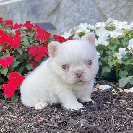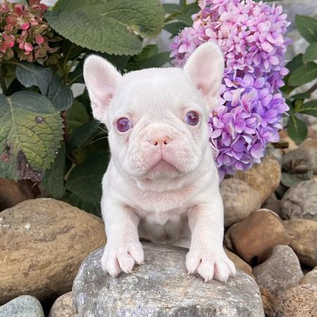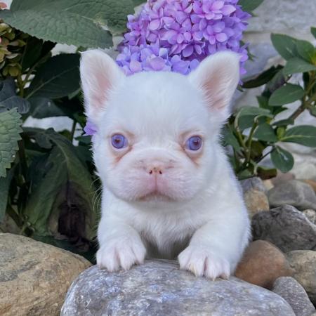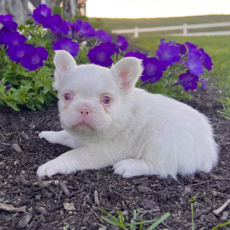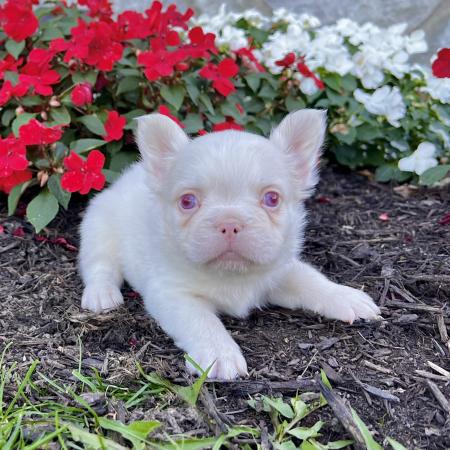 Meet Kalli, a stunning purebred AKC registered rare pink and white Merle “husky koi” colored French Bulldog with dazzling bluish pink eyes and a soft coat. Her rare coloring and compact, well-built frame make her a true standout.