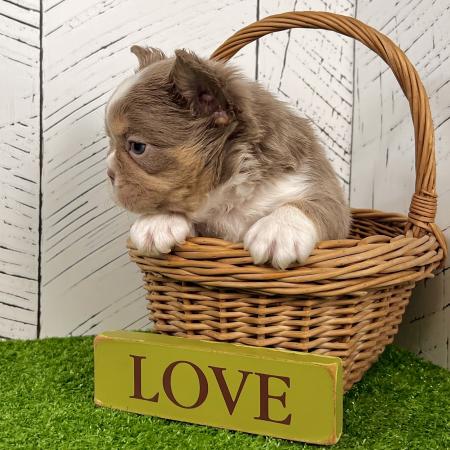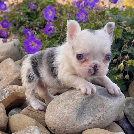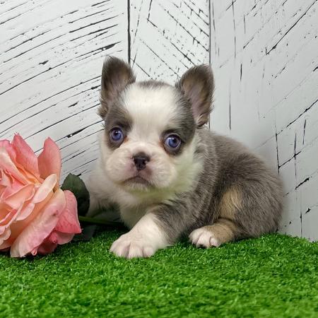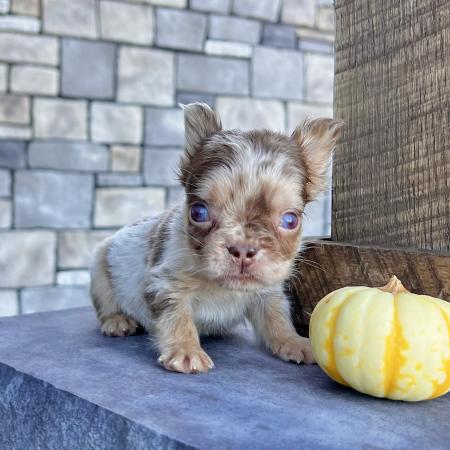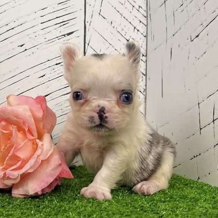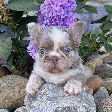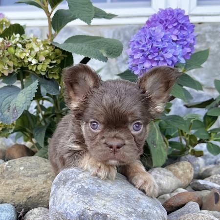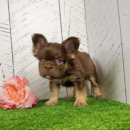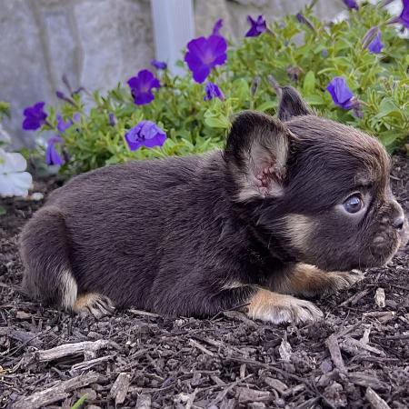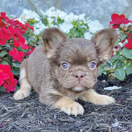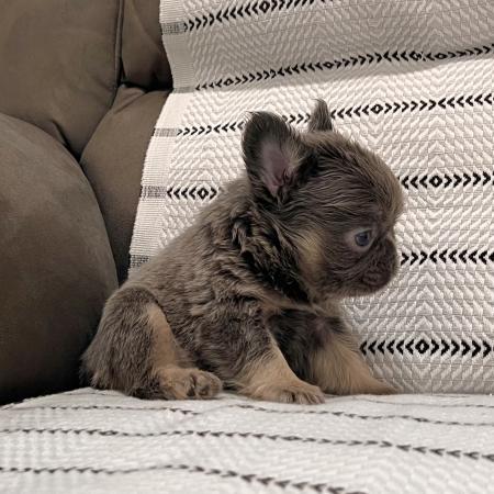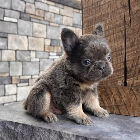 Remi is a beautiful little chocolate tan Merle fluffy purebred Akc registered French bulldog puppy! Beautiful blue eyes! Up to date with all shots and dewormings and comes with a health guarantee! Birthdate is 5/10/25. Family raised and well socialized. Ask us about our delivery options! Contact us today to reserve your new family member! Paul at (330-473-8809). Or email paul@5starpuppies.net.