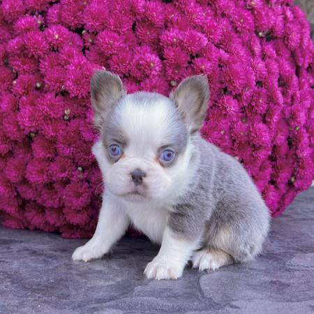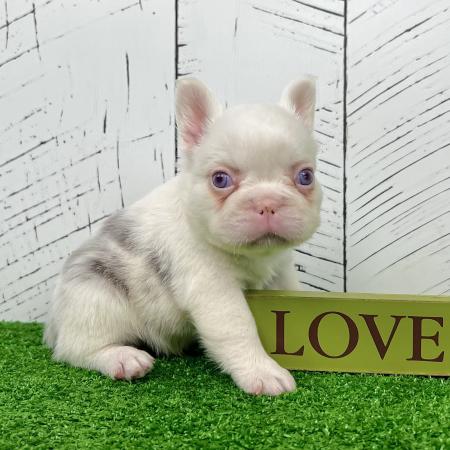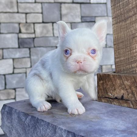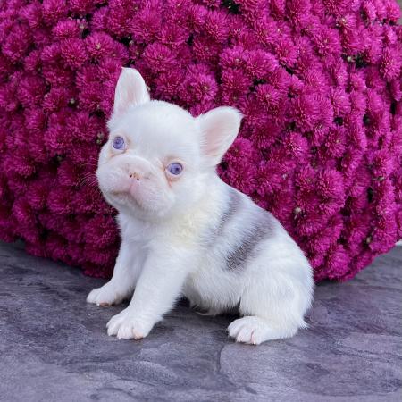 Introducing Kiki, a stunning purebred AKC registered lilac white merle husky koi colored French Bulldog with mesmerizing blue eyes and a one-of-a-kind coat pattern that makes her truly unforgettable. Her soft texture, compact frame, and sweet face showcase top-tier Frenchie quality.