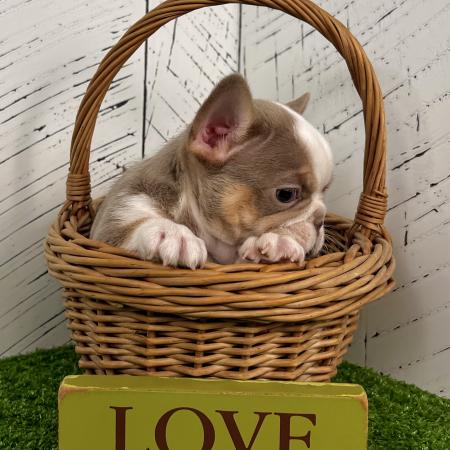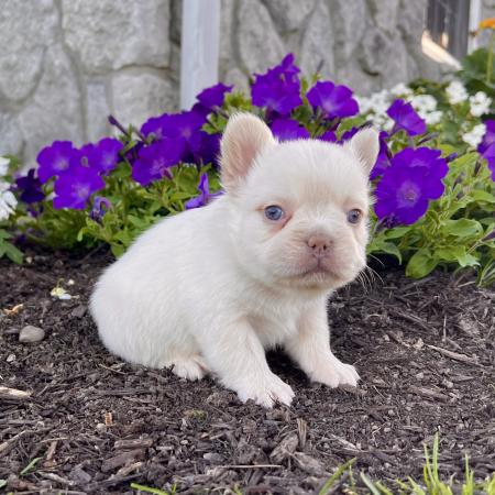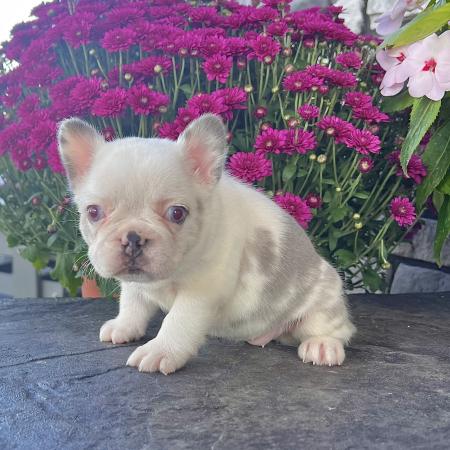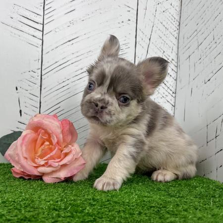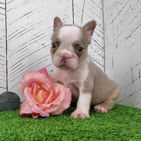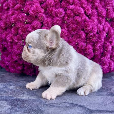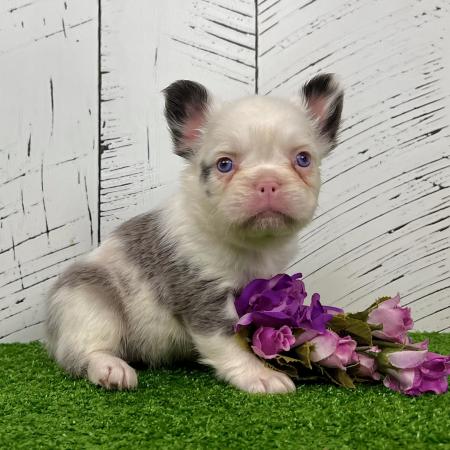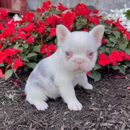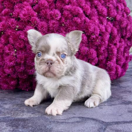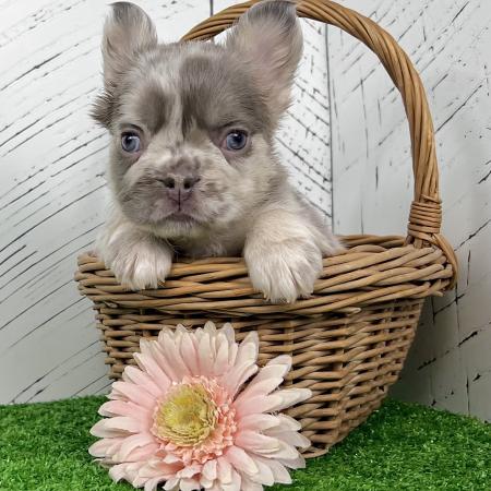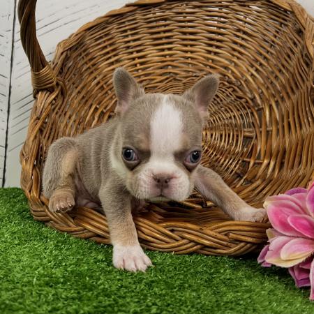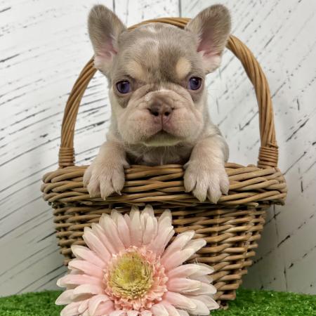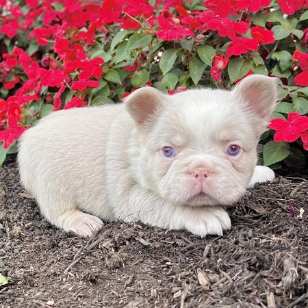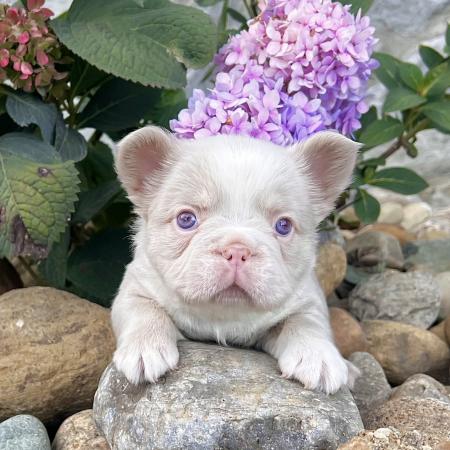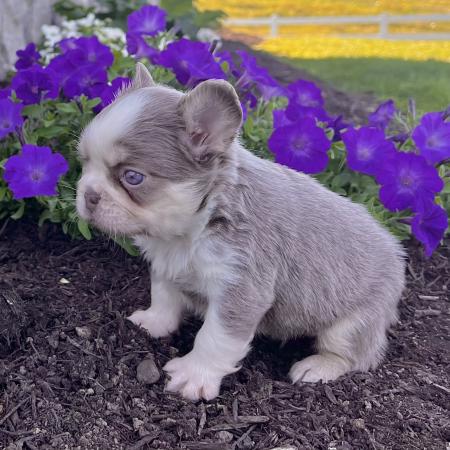 Bonnie is an amazing little lilac tan Merle purebred Akc registered French bulldog puppy! Pretty blue grey eyes! Sweet outgoing personality! Up to date with all shots and dewormings and comes with a health guarantee! Birthdate is 6/2/25. Family raised and well socialized. Ask us about our delivery options! Contact us today to reserve your new family member! Paul at (330-473-8809). Or email paul@5starpuppies.net.