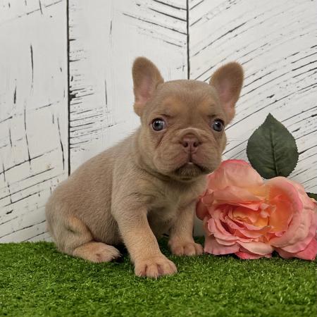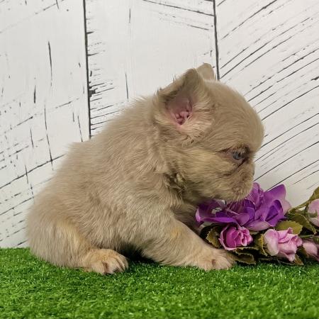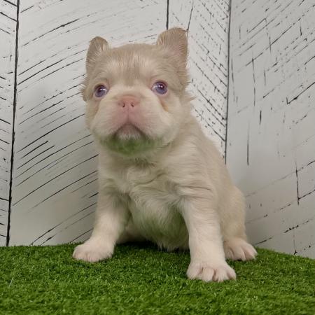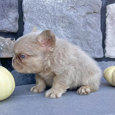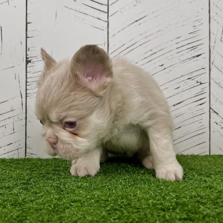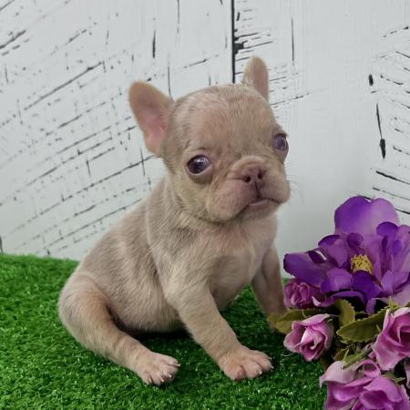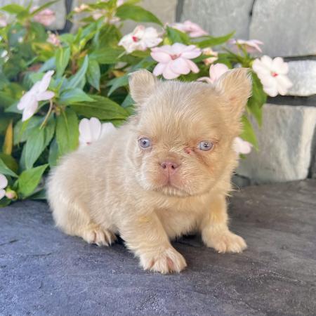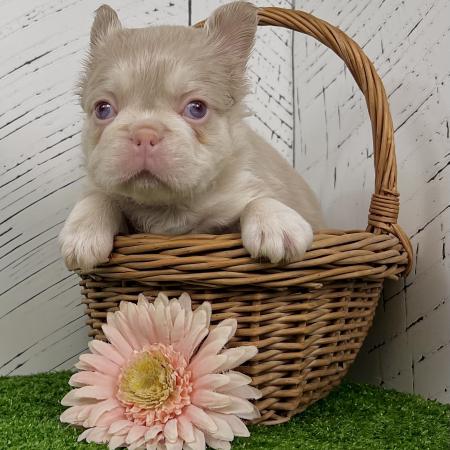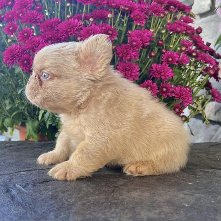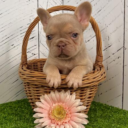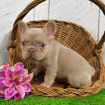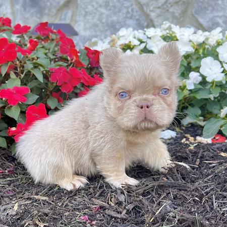 Tammy is a phenomenal little lilac tan fluffy purebred Akc registered French bulldog puppy! Beautiful blue grey eyes! Great quality! Up to date with all shots and dewormings and comes with a health guarantee! Birthdate is 3/22/25. Family raised and well socialized. Ask us about our delivery options! Contact us today to reserve your new family member! Paul at (330-473-8809). Or email paul@5starpuppies.net.