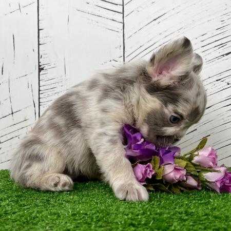 Julia is a gorgeous lilac Merle tan fluffy purebred Akc registered French bulldog puppy! Great quality! Up to date with all shots and dewormings and comes with a health guarantee! Birthdate is 4/19/25. Family raised and well socialized! Ask us about our delivery options! Contact us today to reserve your new family member! Paul at (330-473-8809). Or email paul@5starpuppies.net.