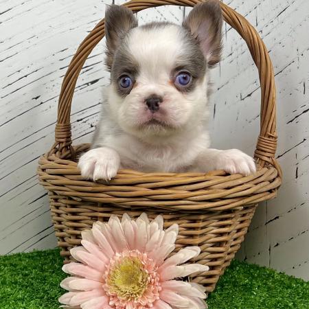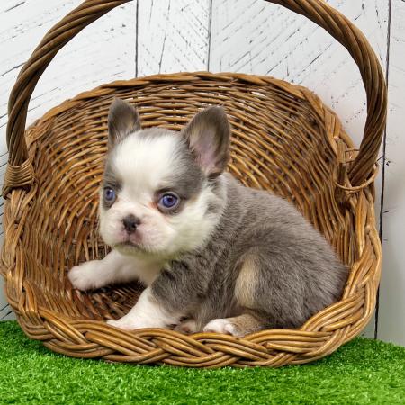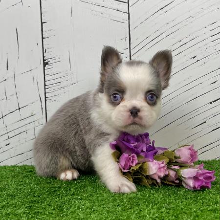 Joy is a beautiful little lilac Merle tan purebred Akc registered French bulldog puppy! Great quality! Bright blue eyes! Up to date with all shots and dewormings and comes with a health guarantee! Birthdate is 4/19/25. Family raised and well socialized! Ask us about our delivery options! Contact us today to reserve your new family member! Paul at (330-473-8809). Or email paul@5starpuppies.net.