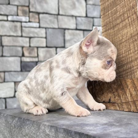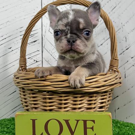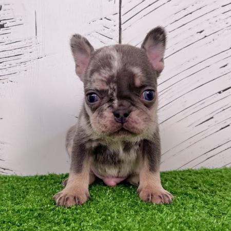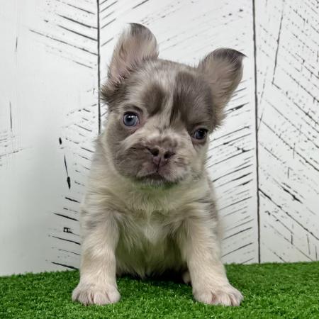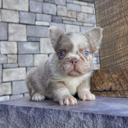 Banjo is an awesome little lilac tan Merle purebred Akc registered French bulldog puppy! Nice blue grey eyes! Up to date with all shots and dewormings and comes with a health guarantee! Birthdate is 6/2/25. Family raised and well socialized. Ask us about our delivery options! Contact us today to reserve your new family member! Paul at (330-473-8809). Or email paul@5starpuppies.net.