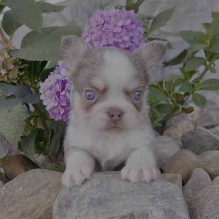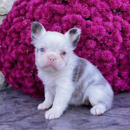 Rambo is a purebred AKC registered lilac Merle and white “husky koi” fluffy French Bulldog with piercing blue eyes and a beautifully unique coat pattern that’s sure to turn heads. His build is compact and sturdy, showing excellent structure and true Frenchie quality.