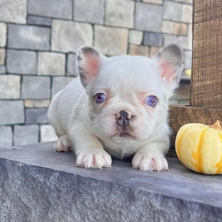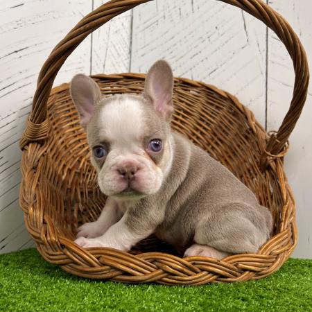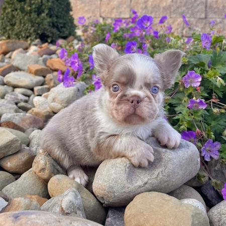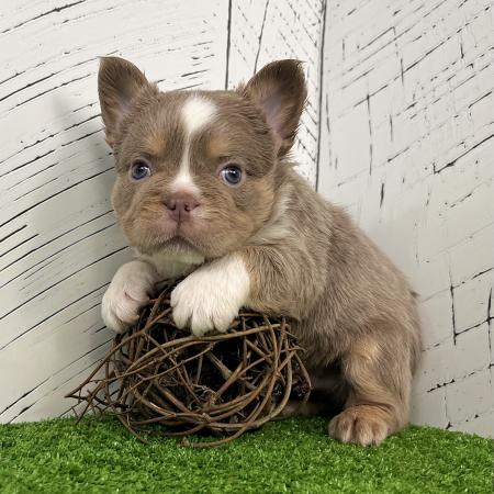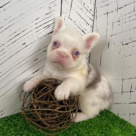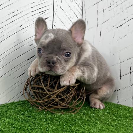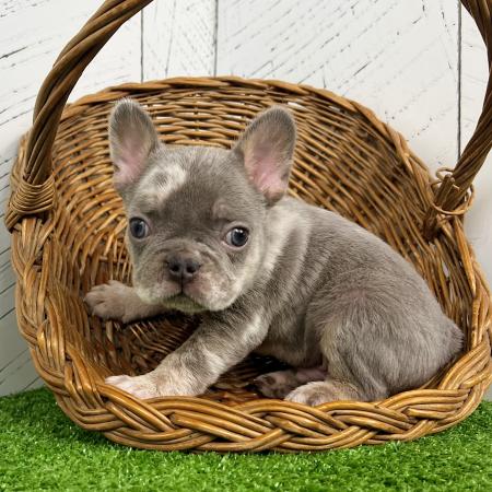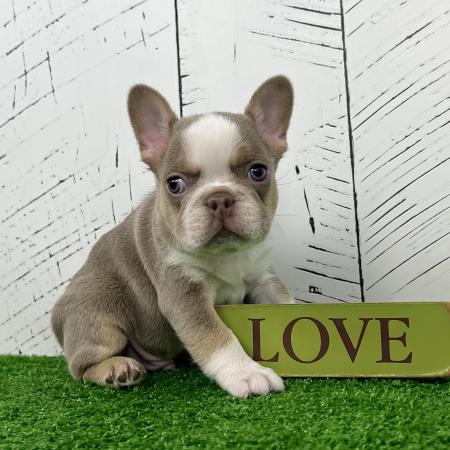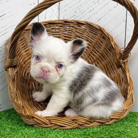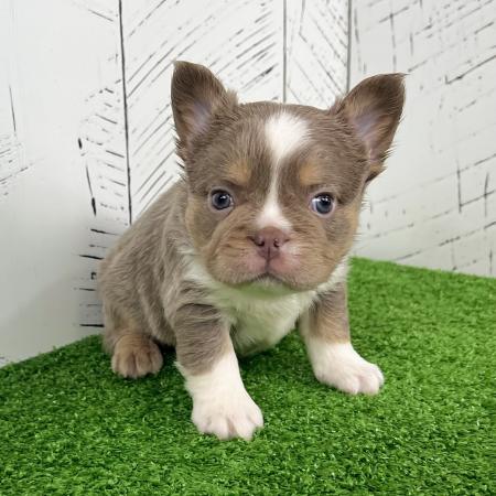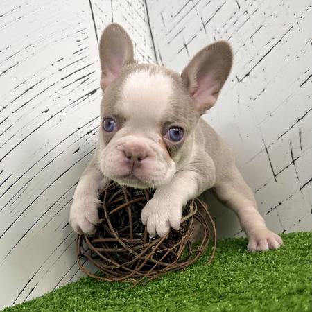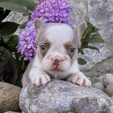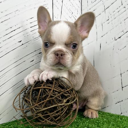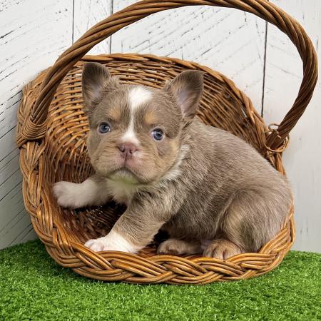 Buster is a picture perfect little lilac tan Merle and white purebred Akc registered French bulldog puppy! Compact and chunky Outstanding quality! Up to date with all shots and dewormings and comes with a health guarantee! Birthdate is 6/2/25. Family raised and well socialized. Ask us about our delivery options! Contact us today to reserve your new family member! Paul at (330-473-8809). Or email paul@5starpuppies.net.