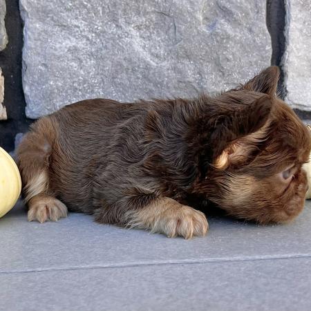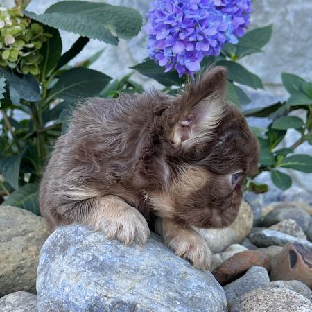 Looking for elegance wrapped in a fluffy bundle? Luna is a stunning chocolate and tan, fluffy, purebred AKC registered French Bulldog puppy. Her rich coloring and teddy-bear fluff make her simply irresistible!