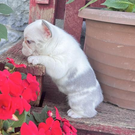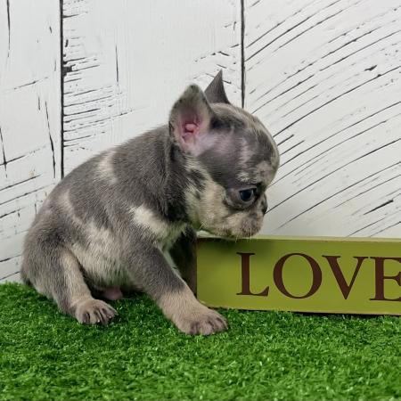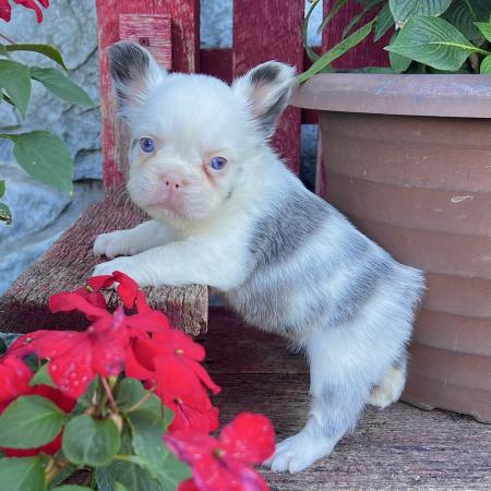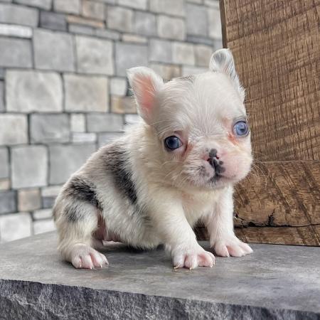 Bingo is a colorful little lilac tan Merle and white purebred Akc registered French bulldog puppy! He is a tiny guy with a big heart! Up to date with all shots and dewormings and comes with a health guarantee! Birthdate is 6/2/25. Family raised and well socialized. Ask us about our delivery options! Contact us today to reserve your new family member! Paul at (330-473-8809). Or email paul@5starpuppies.net.