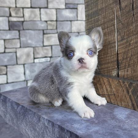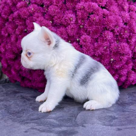 Introducing Ritsy, a stunning purebred AKC registered blue Merle and white “husky koi” colored fluffy French Bulldog with mesmerizing blue eyes and a beautifully soft coat. Her rare pattern, compact build, and sweet face make her a true standout — she’s the kind of Frenchie that captures attention everywhere she goes.