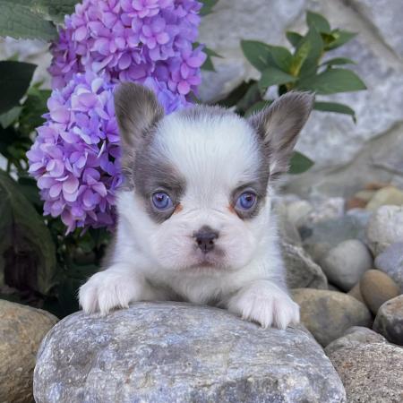 Looking for a rare and stunning French Bulldog? Armani is a purebred AKC registered French Bulldog with an eye-catching chocolate merle & white coat and dazzling blue eyes! He’s a one-of-a-kind puppy that’s as sweet as he is striking.
