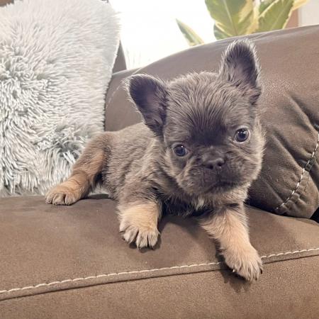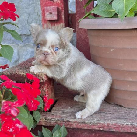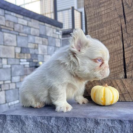 Trouble is a stunning lilac tan Merle fluffy purebred Akc registered French bulldog puppy! Blue grey eyes! Great quality! Up to date with all shots and dewormings and comes with a health guarantee! Birthdate is 3/22/25. Family raised and well socialized. Ask us about our delivery options! Contact us today to reserve your new family member! Paul at (330-473-8809). Or email paul@5starpuppies.net.
