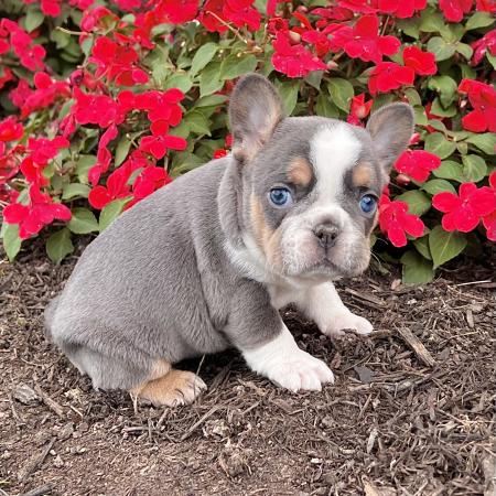 Meet Heidi, a breathtaking lilac and tan Purebred AKC Registered French Bulldog puppy with striking blue eyes that will capture your heart instantly. Her perfect white feet, blaze, and belt markings make her one-of-a-kind, while her short, compact, and chunky build shows off her extreme Frenchie quality.