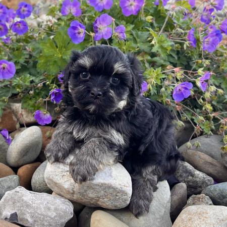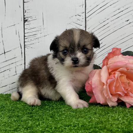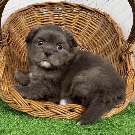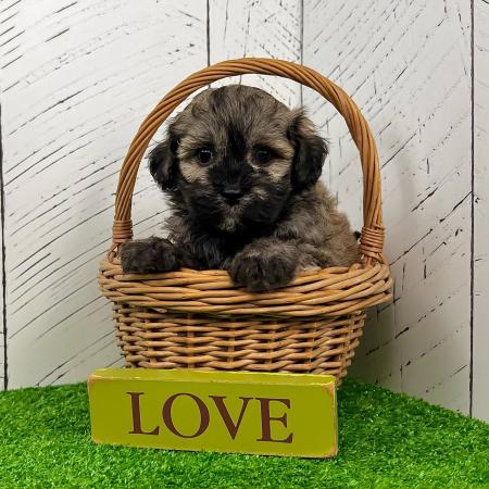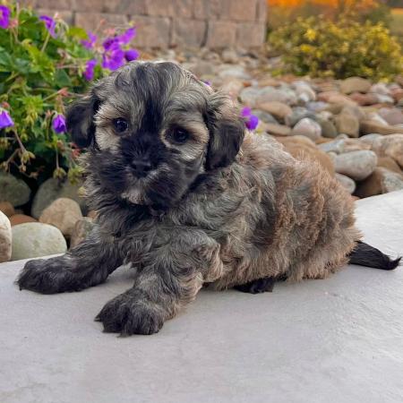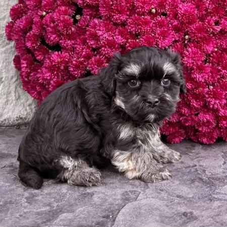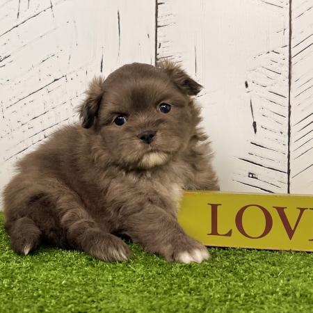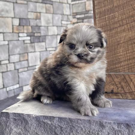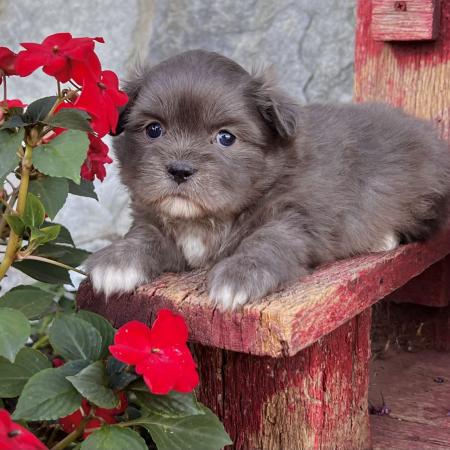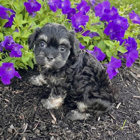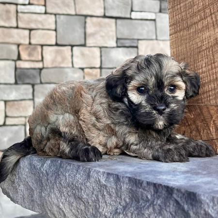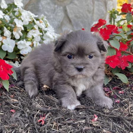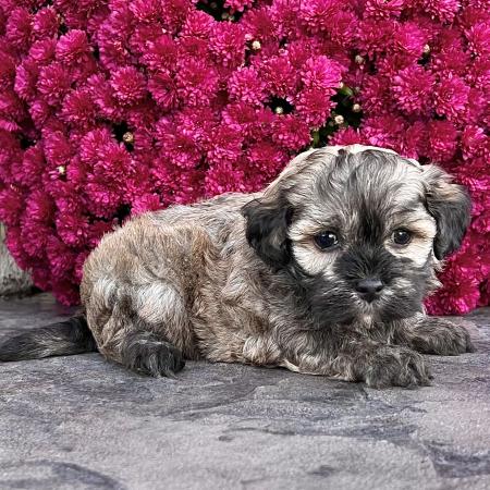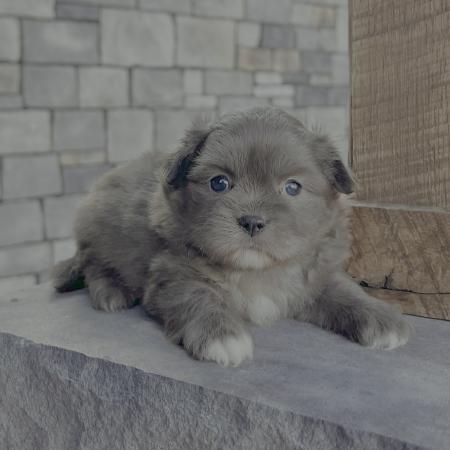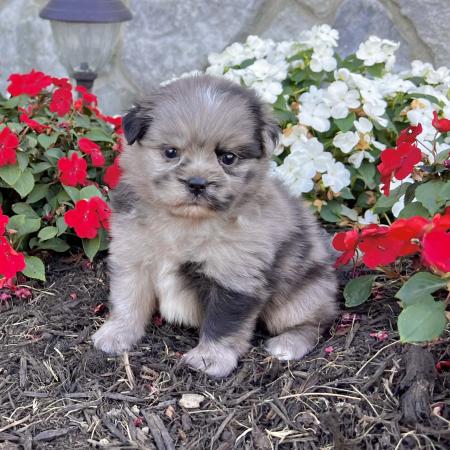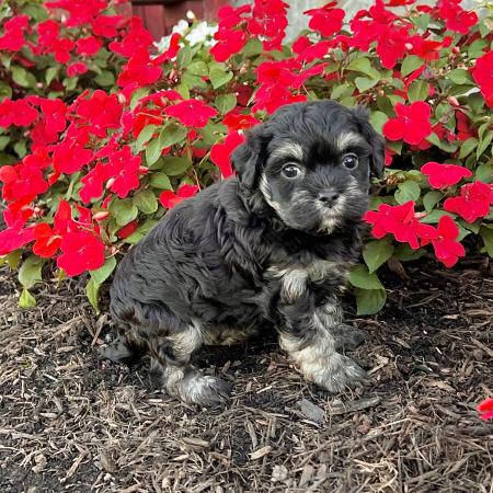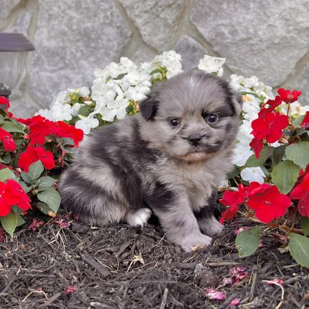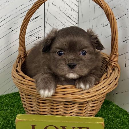 Looking for a puppy that truly stands out? Dazzle is a stunning Merle Shih Tzu–Pomeranian mix with a striking coat, and the classic teddy bear face everyone falls in love with! His fluffy fur and playful personality make him just as sweet as he is handsome.