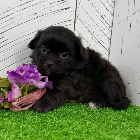 Destiny is an adorable black Shih Tzu–Pomeranian mix with the cutest little white toes and a chest patch that makes her extra unique! She has the teddy bear face of a Shih Tzu and the fluffy coat of a Pomeranian—perfect for snuggles and playtime.