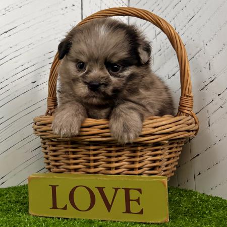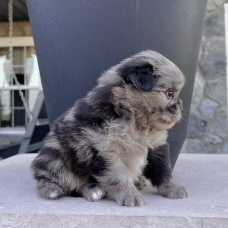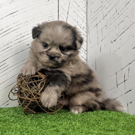 Say hello to Derek, a striking grey Merle Shih Tzu–Pomeranian mix with perfect little white toes and a sweet chest patch. His teddy bear face and soft, fluffy coat make him absolutely irresistible!