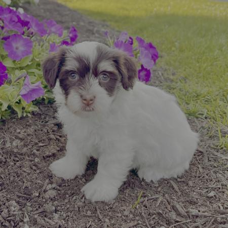 Calvin is a purebred AKC registered Havanese puppy with a stunning chocolate sable and white coat that gleams in the light. His soft curls and expressive eyes capture both charm and intelligence — the perfect mix for a loyal and loving companion.